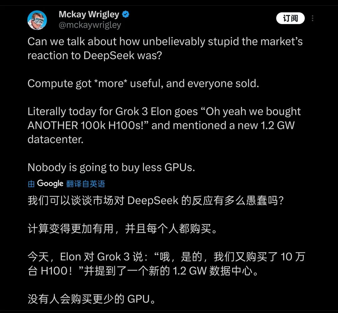 而为了这些差距,马斯克所付出的代价堪称高昂:在发布会中,马斯克用近乎炫耀的口吻表示,用了 20 万张 H100(马斯克直播中表示使用「超过 10 万」张) 训练 Grok3,总训练小时数达到两亿小时。这让一部分人觉得这是对 GPU 行业的又一个重大利好,并认为 DeepSeek 给行业带来的震动是「愚蠢」的。