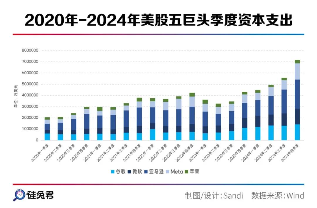 据微软、谷歌、亚马逊和Meta的报告,仅这4家美股科技巨头在2025年的资本支出总额为3500亿美元——Meta预计2025年全年总支出将在1000亿美元至1190亿美元之间;谷歌计划在2025年投资750亿美元用于资本支出,远高于市场预期的588亿美元;亚马逊计划2025年投资1000亿美元,微软计划在2025财年投资800亿美元。