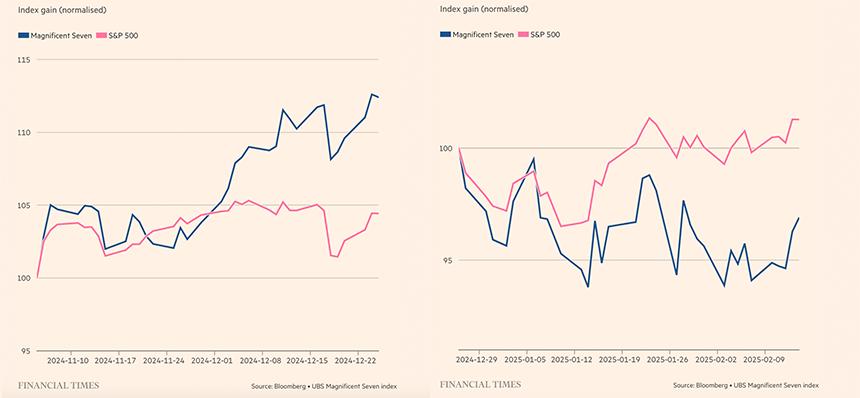 美股七巨头2024年年底与2025年年初股价变化来源:英国《金融时报》