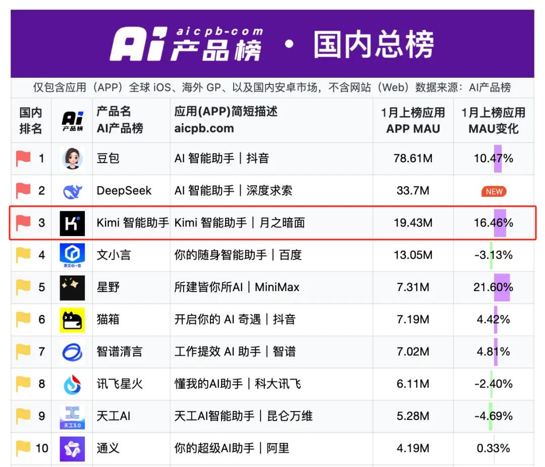 但时至2025年1月,Kimi的月活下降至约1900万。显然,在DeepSeek的超级AI应用叙事之下,Kimi用户流失很难止血。