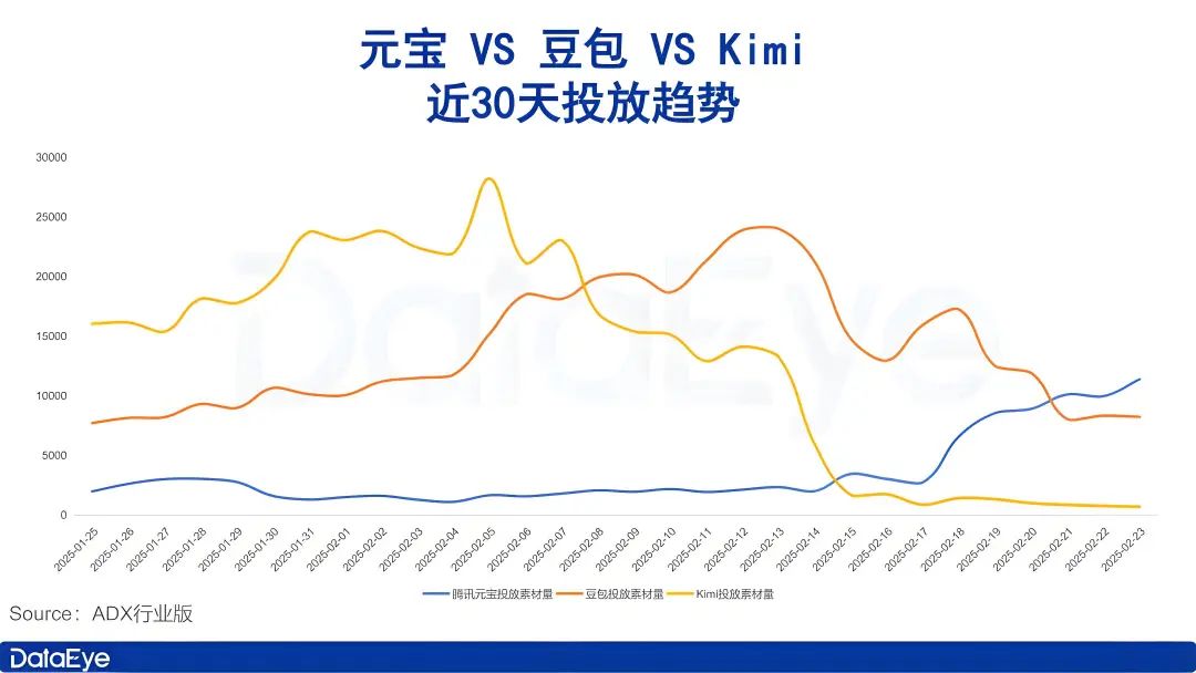 豆包在2月5日后投放力度先有一定程度上涨,后又大幅下滑,保持着与1月下旬相似的投放力度。与之相比,元宝的变化更为明显。