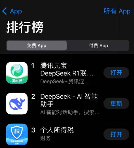 万万没想到,在苹果中国区App Store免费App下载排行榜上,腾讯元宝最终反超了DeepSeek,坐上了“一哥”的位置。