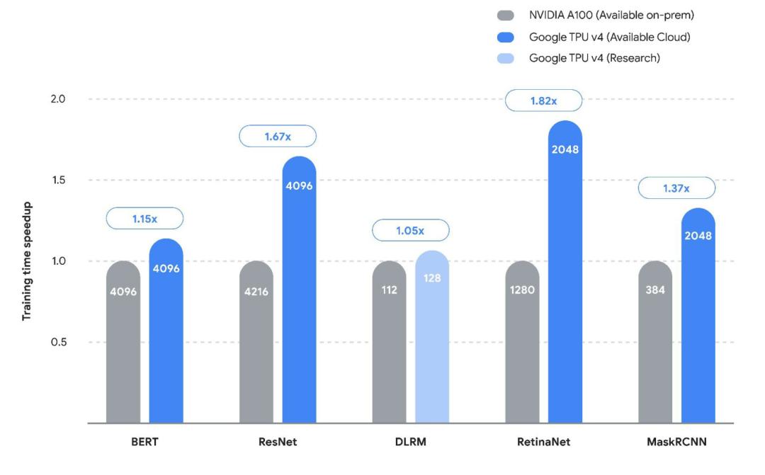 谷歌此前公布的TPU V4与A100针对不同架构模型的训练速度