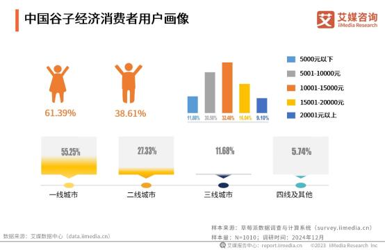 另一方面,以Z世代为主的“吃谷”群体,有着庞大的消费潜力。根据艾媒数据,谷子经济的消费者主要为女性,超半数分布在一线城市,且收入普遍不低,有足够的能力进行情绪消费。