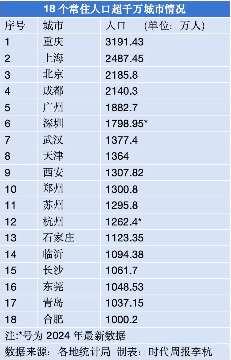 日前,安徽省统计局发布的数据显示,2024年末,合肥常住人口达到1000.2万人,正式迈入“千万人口城市”行列。至此,全国千万人口城市增至18座。