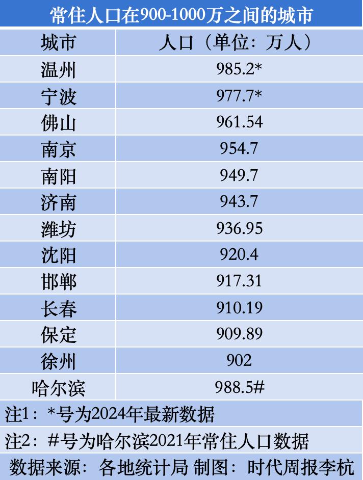 时代周报记者梳理发现,目前全国共有13座城市的常住人口处于900万至1000万区间,其中温州、宁波、佛山、南京四座城市人口规模突破950万大关,构成冲击千万人口的第一梯队。