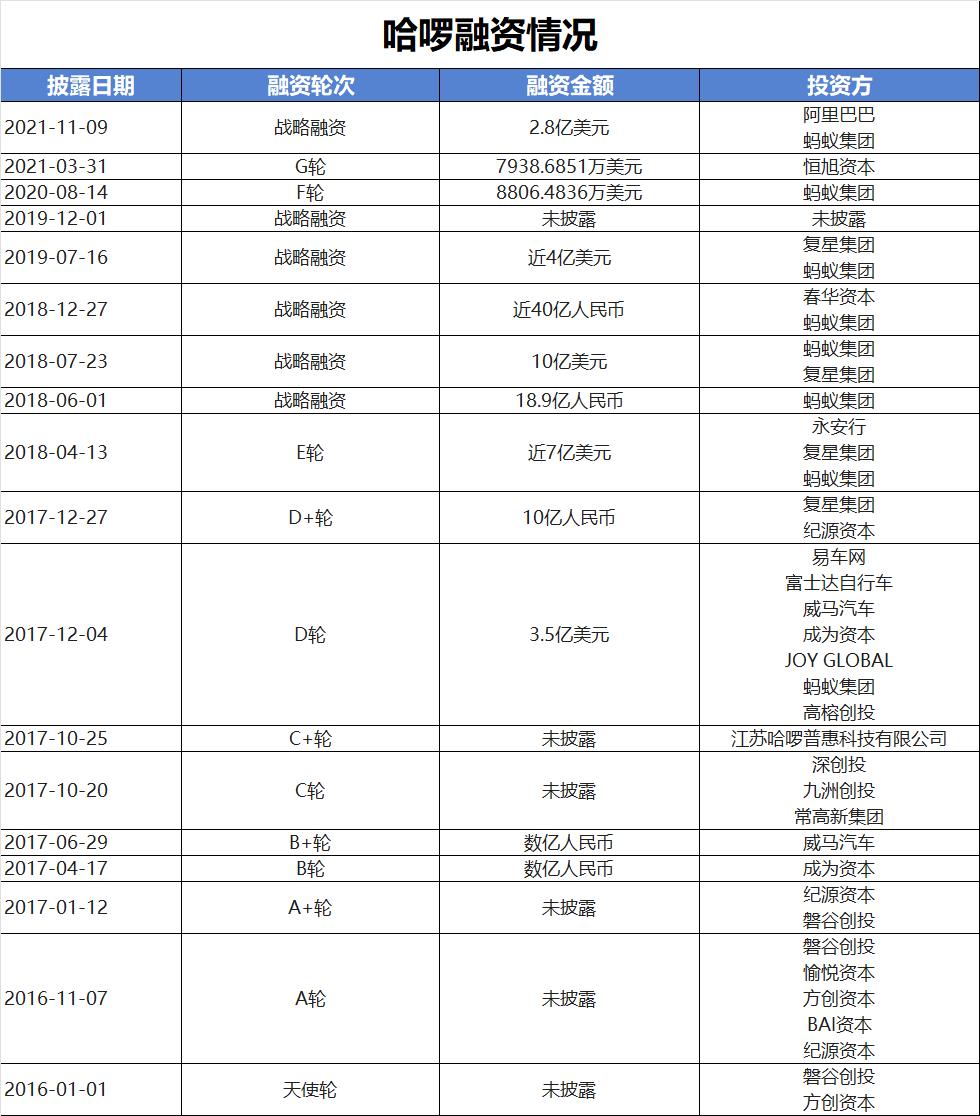 此外,自2016年成立以来,哈啰已经完成十余轮融资,背后投资方包括蚂蚁集团、复星集团、春华资本、纪源资本、成为资本、深创投等,甚至永安行也在2017年的业务并购中进入哈啰的股东序列。