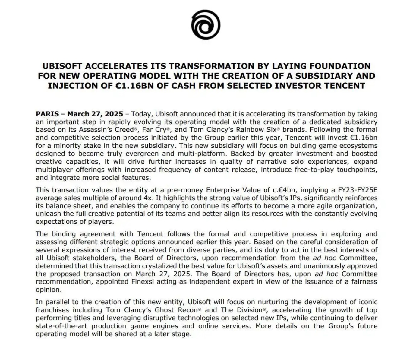 2025年3月27日,全球游戏行业迎来重磅消息:法国育碧(Ubisoft)宣布拆分旗下三大旗舰IP《刺客信条》《孤岛惊魂》《彩虹六号》及其开发团队,成立独立子公司并引入腾讯11.6亿欧元战略投资。