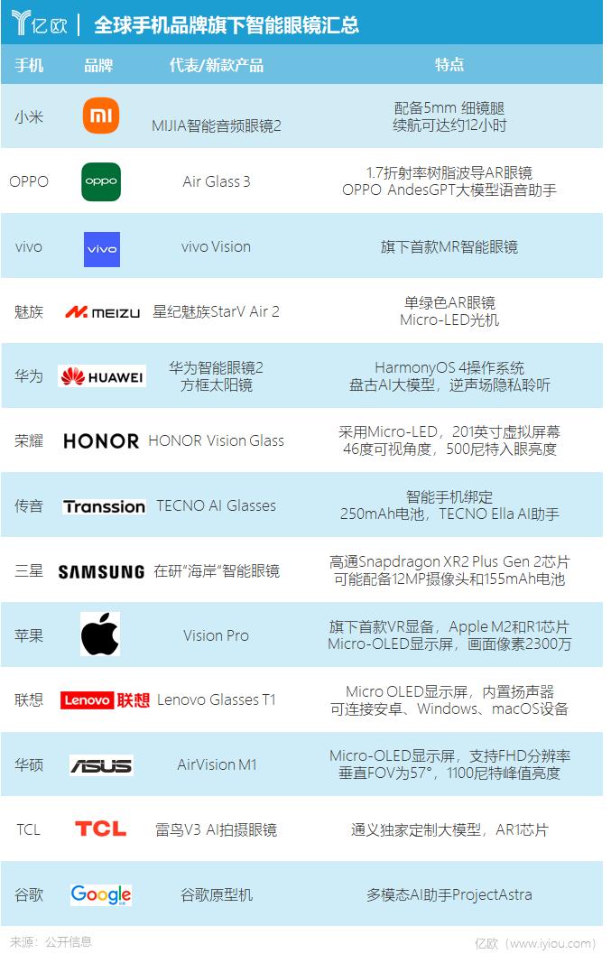 目前,几乎所有手机厂商都已进入智能眼镜(含头显)市场。据亿欧不完全统计,全球已有13家主流手机厂商发布相关产品(含在研),成为智能眼镜赛道的重量级玩家。