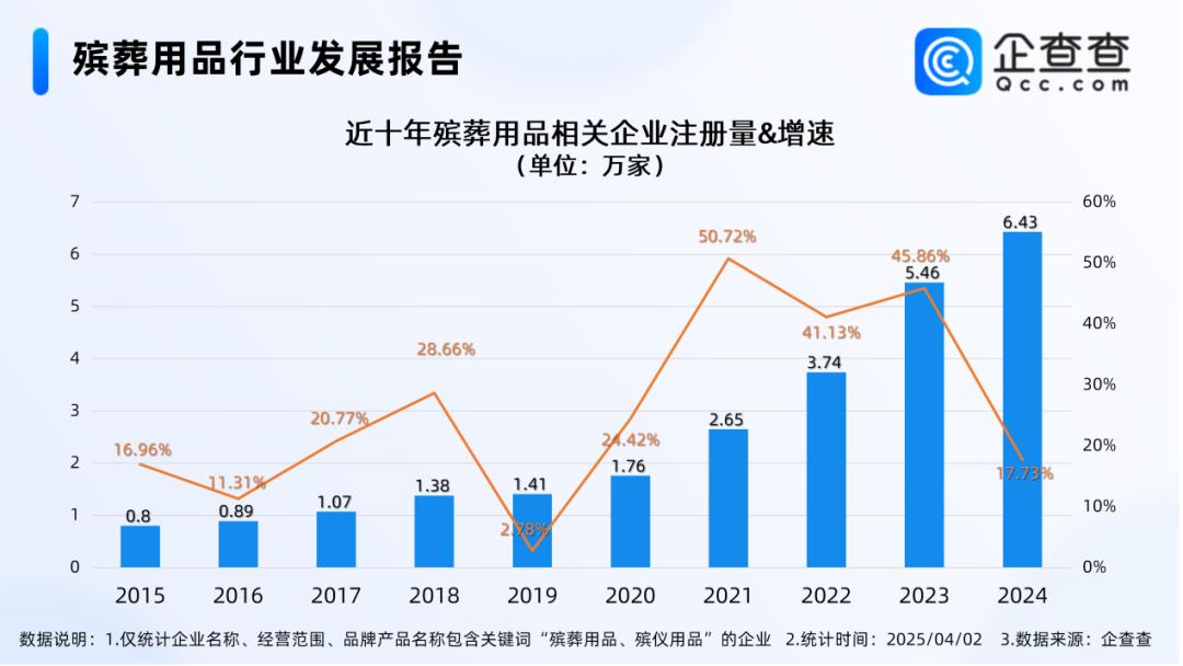 企查查数据显示,国内现存殡葬用品相关企业28.06万家。近十年相关企业注册量呈持续增长态势,2021年全年注册相关企业2.65万家,同比增长50.72%,达近十年注册量增速峰值。2024年全年注册6.43万家相关企业,同比增长17.73%。