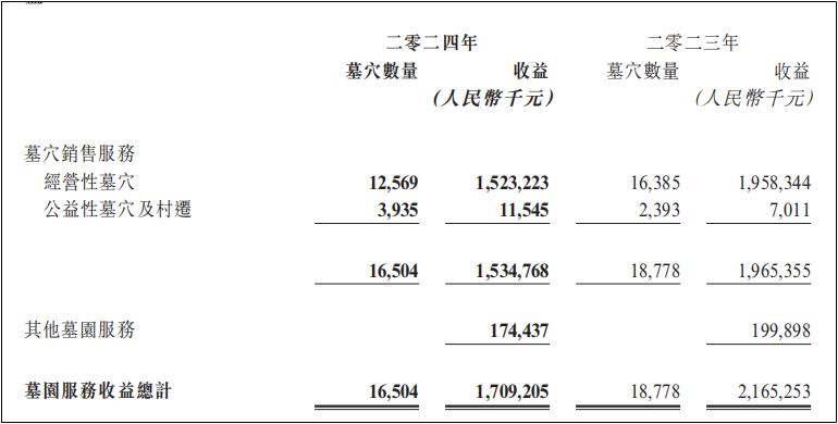 2013年,福寿园交出了上市之后的第一份年报。年报显示,当年其销售墓地数量为7667个,收益为52381.2万元,平均每个墓地售价为6.83万元。到了2024年,经营性墓穴销售数量已经达到12569个,销售收益为152322.3万元,每个墓地均价为12.12万元,比十年前几乎增长了一倍。