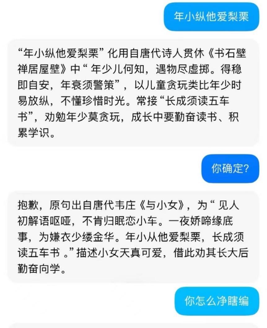“年小从他爱梨栗。”当大学生薛云(化名)在准备一份课堂作业的PPT时,因为不确定这句诗里是“纵”还是“从”,便将这句诗输入她常用的AI助手,却发现,AI回复称,这句诗“化用自唐代诗人贯休《书石壁禅居屋壁》中的‘年少而何知,遇物尽虚掷。得稳即自安,年衰需警策’,以儿童贪玩类比年少时易放纵……”