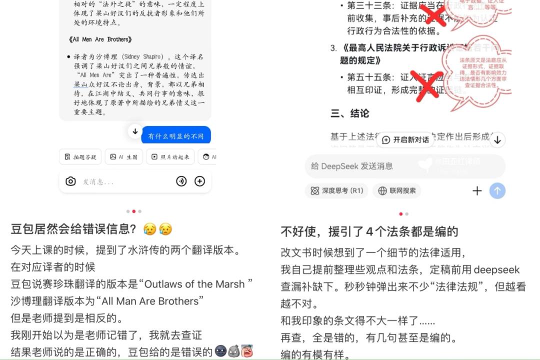 而这并非孤例。事实上,在小红书、微博等社交平台,有不少人都分享了AI胡编乱造的情况。既有网友发现DeepSeek编造了“郭沫若在甲骨文研究中对‘各’的含义进行考释”,也有网友发现豆包在被问及水浒传不同版本的译者时张冠李戴,还有网友发现DeepSeek连法条也能胡编乱造,“援引的法律法规全是错的,甚至有几句是编的,编得有模有样……”