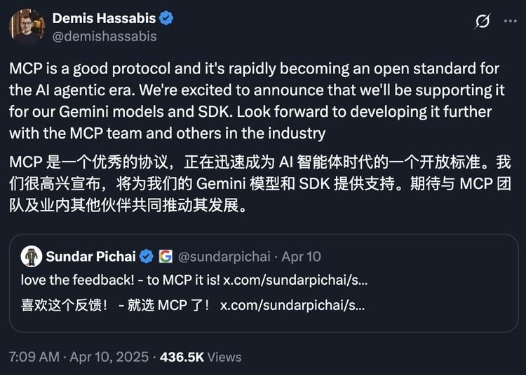 AI领域的互操作性标准之争正变得异常热闹。就在本周,Google DeepMind CEO Demis Hassabis宣布,将为其Gemini模型添加对Anthropic主导的模型上下文协议MCP的支持,称其为“一个优秀的协议,正迅速成为 AI Agent 时代的开放标准”。这距离OpenAI CEO Sam Altman宣布支持MCP仅仅过去几周时间。