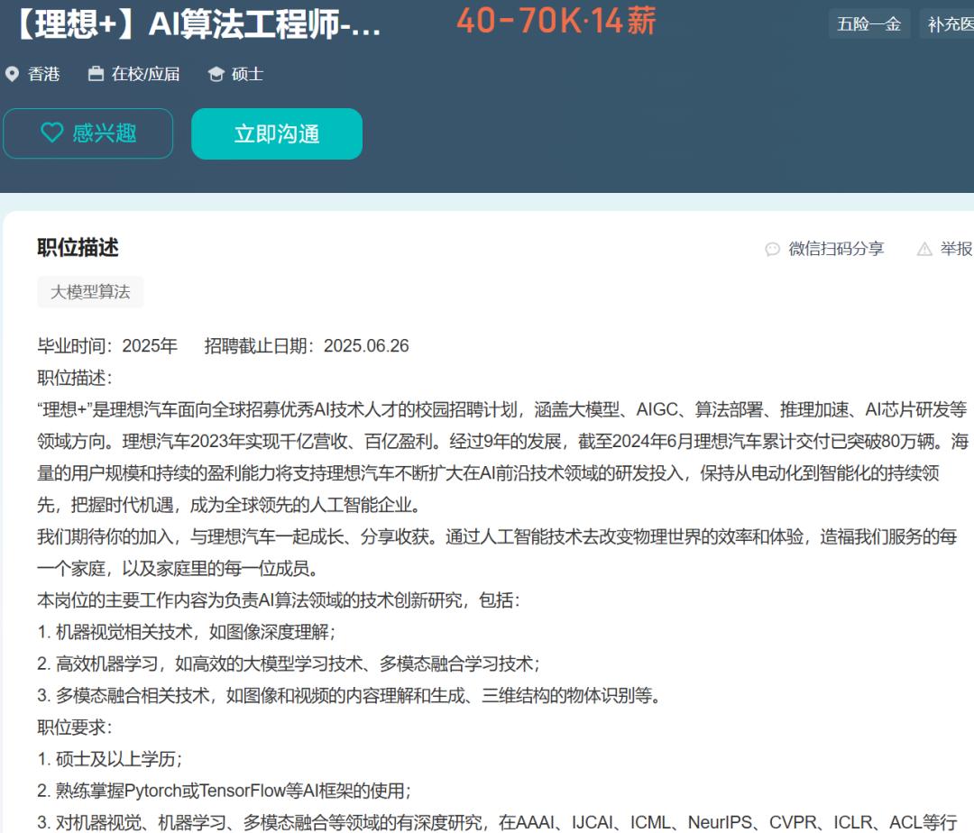 自从去年将企业愿景升级为“连接物理世界和数字世界,成为全球领先的人工智能企业”后,理想汽车开始加大了AI人才的招聘。