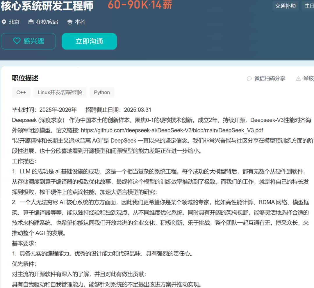 相比学历,他们更加重视工程和学术能力。比如,在深度求索岗位招聘里,强调了有实际研发经验,或者能独立解决复杂的技术问题优先。