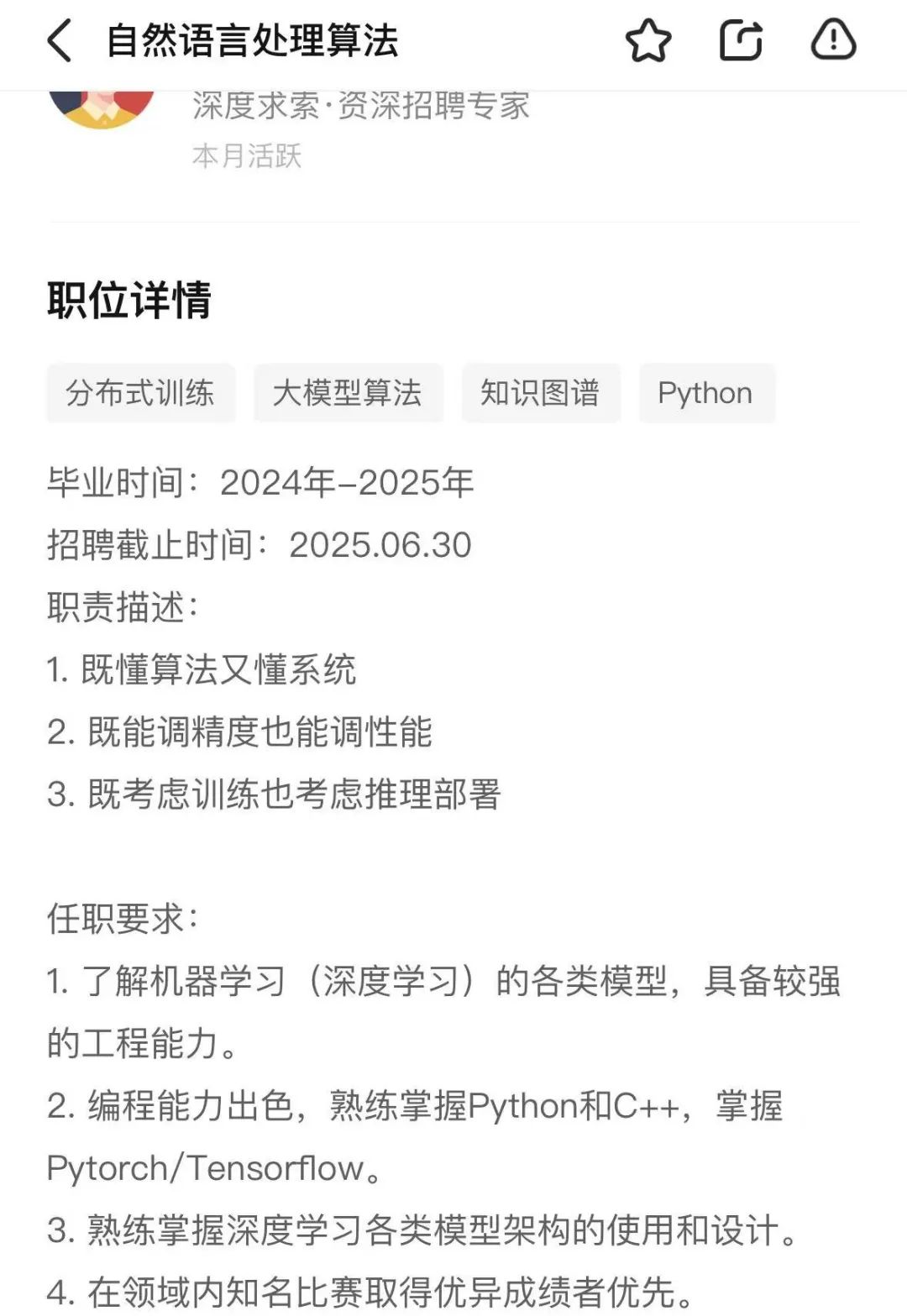 比如,深度求索招聘“自然语言处理算法”时,明确提到“了解机器学习的各类模型,具备较强的工程能力”;