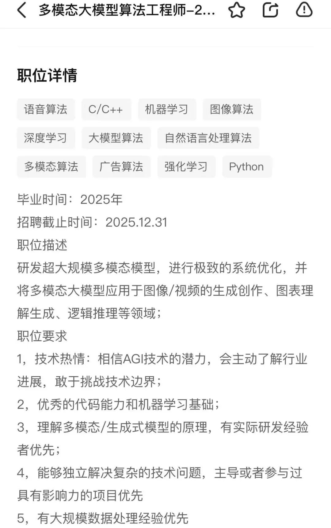 再比如,MiniMax在招聘“多模态大模型算法工程师”时,也强调了“理解多模态模型原理,有实际研发经验者优先”或者“能独立解决复杂的技术问题,主导或参与过具有影响力项目优先”。
