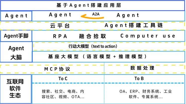 首先我们必须明确的是:Agent不仅仅是一种应用形态,将其简单对比“超级应用”实际上是对其本质的误解。Agent代表了一条全新的产业链,它连接并整合了多个技术环节,需要调动几乎整个互联网生态的软件资源。