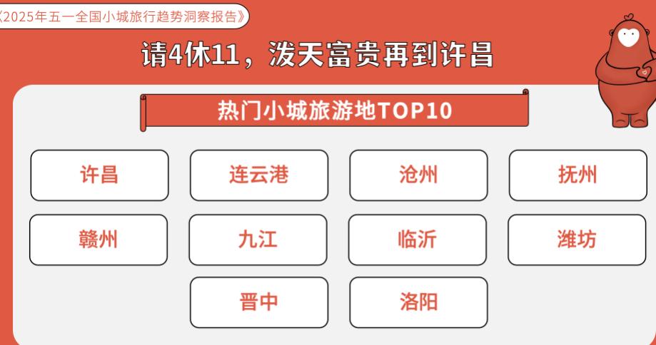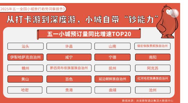 另据《2025年五一全国小城旅行趋势洞察报告》显示,胖东来大本营的许昌,预订量同比增速和热门小城旅游目的地均在TOP3之列。啄木鸟数据同样提到,五一县域民宿126%的订单增速,远超平台73.6%的大盘增速。