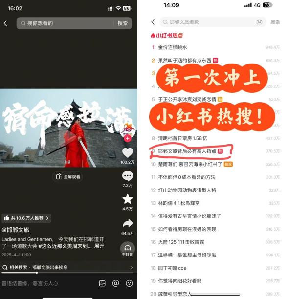 这一创意视频,不仅在抖音收获百万点赞,且“邯郸文旅背后必有高人指点”更是首次冲上小红书热搜。