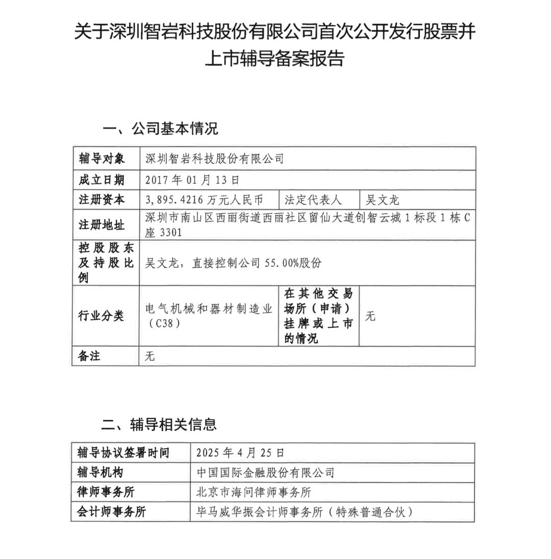 5月8日,智能家居产品研发商深圳智岩科技股份有限公司(下称:智岩科技)在深圳证监局进行辅导备案登记,辅导机构为中金公司。