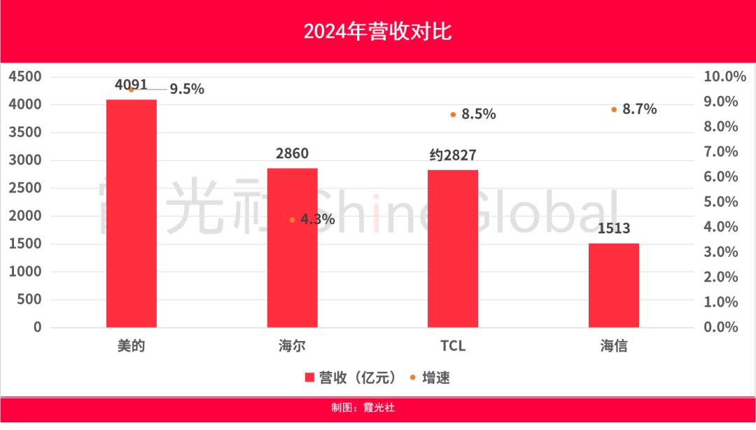 从2024年财报来看,五大家电巨头除了格力(格力2024全年营收1900亿,同比下滑7.31%),其余四家均实现了营收增长,其中美的、海信、TCL三家增长均超过7%。