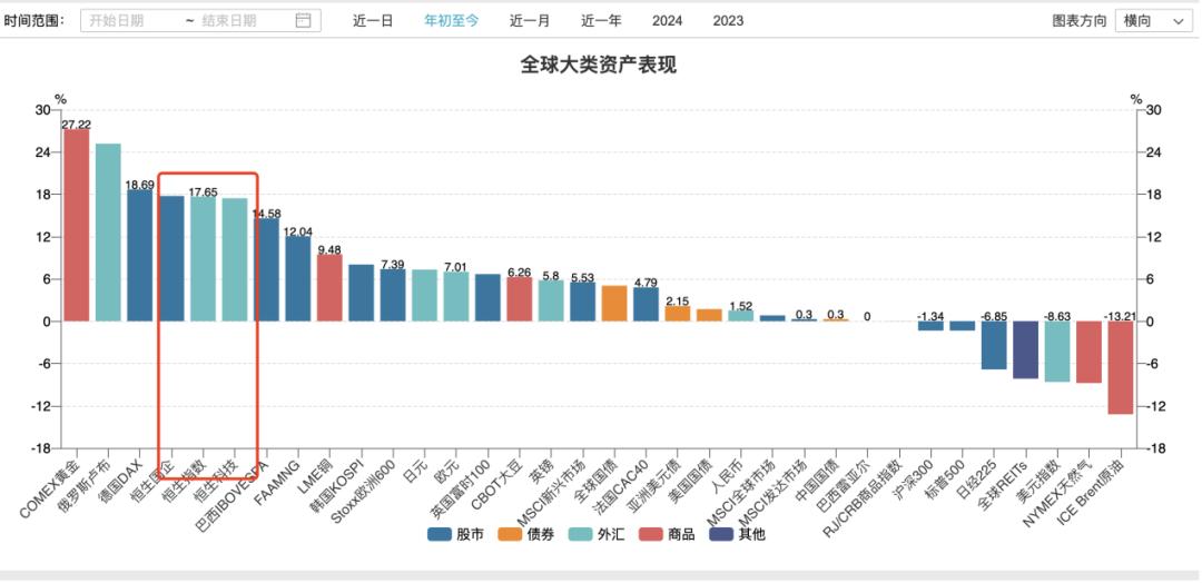 2025年年初至今,恒生指数涨幅达到17.65%,在全球股票市场中领跑。