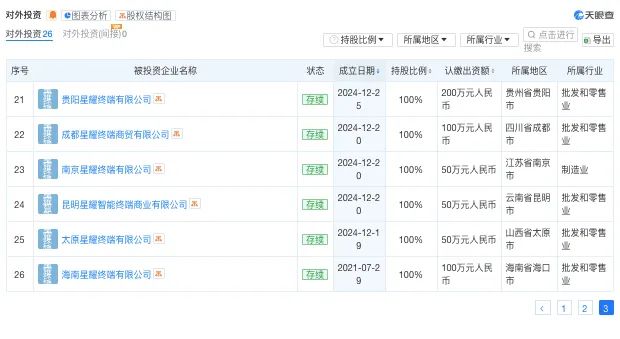 相隔不久,自2024年12月19日起,荣耀全资子公司深圳星耀终端有限公司就开始密集进行对外投资,在太原、成都、南京星耀终端有限公司、昆明等地设立子公司,迄今共新开25家新公司,经营范围均包含可穿戴智能设备、智能机器人、智能无人飞行器等多个前沿科技领域。
