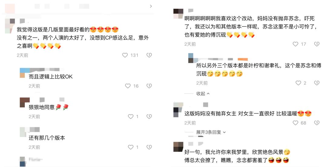 “有一个本子,女主误会男主绑架了她妈妈和弟弟,真相却是女主被这两个亲人给主动抛弃了,我最开始刷到这个版本的时候,跟大家一样都觉得女主就是个没人要的小可怜,所以当男主坚定选择她的时候,救赎感一下子就上来了”。直到孙曼近期刷到了另一个版本,“这次把女主被她妈抛弃的设定给改了,圆成了在男主的帮助下,她妈带着生病的弟弟去国外治疗了,看大家的反馈都觉得这个改动很温馨,比起之前女主一心为了亲人着想,结果她自己却成了被抛弃的那一个的纯虐要好多了。”