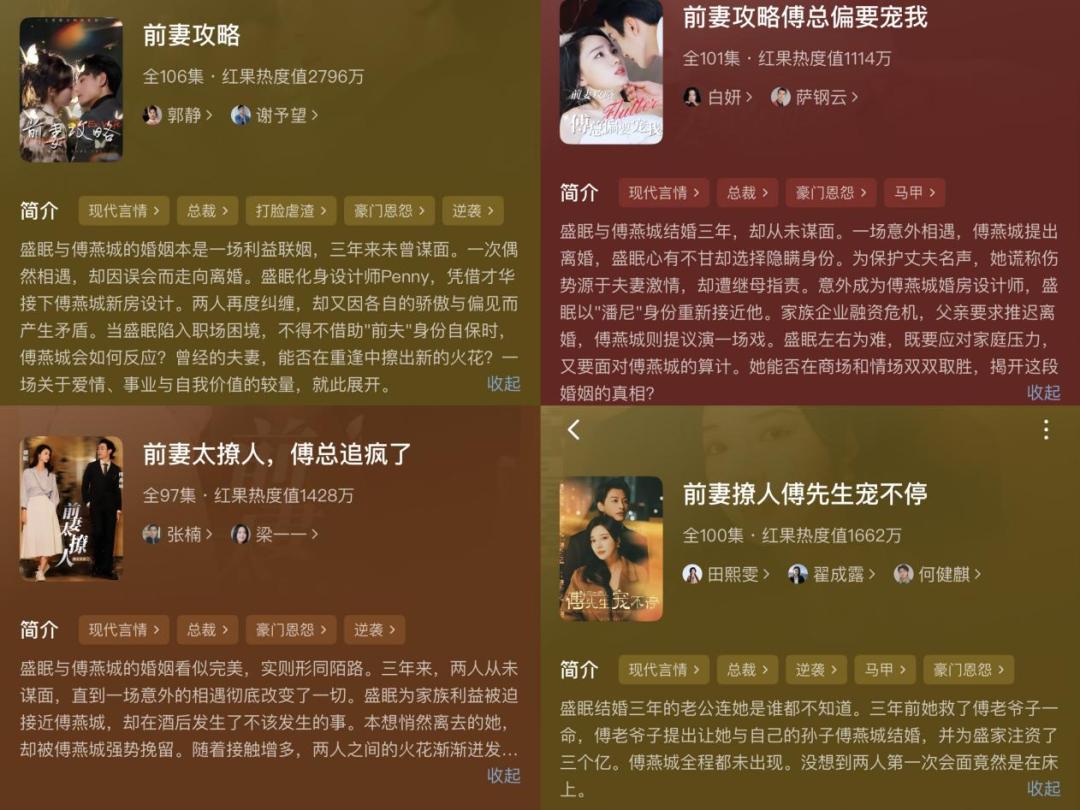 “自从各种衍生版,比如现代、古代、民国、修仙,各种时代背景都在套用过后,它就从‘一本多拍’上升成一种标准模板了”。眼下,这个剧情模式已经被应用到多个不同类型的短剧中,无论是都市情感、青春校园,还是悬疑推理、奇幻仙侠,几乎都能看到“前妻攻略”的影子。