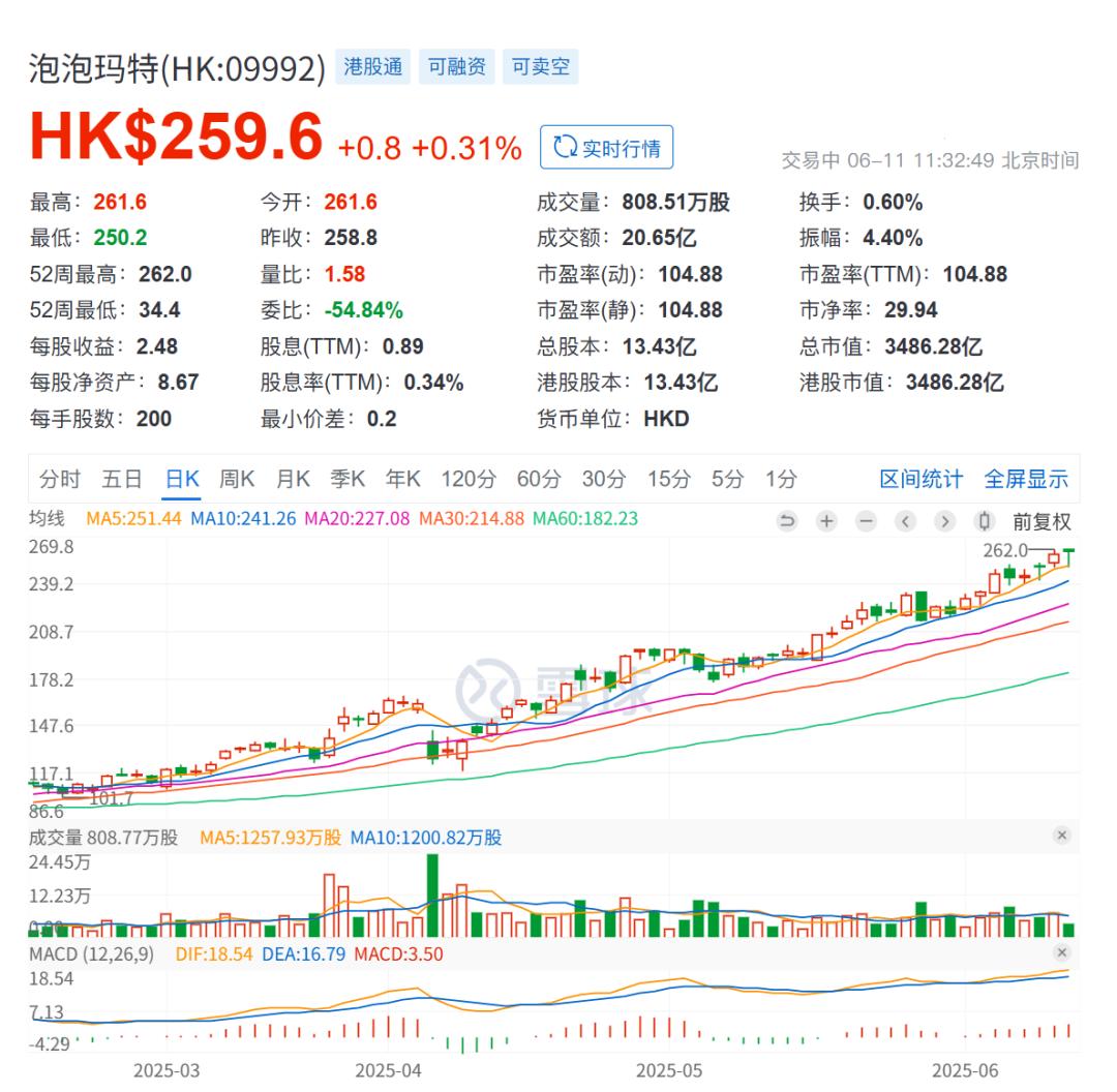 资本市场的狂热直接反映在股价上:截至6月11日发稿前,泡泡玛特股价达252.60港元/股,总市值飙升至3392亿港元,较2024年3月最低点18港元/股左右的价格涨幅超1400%。