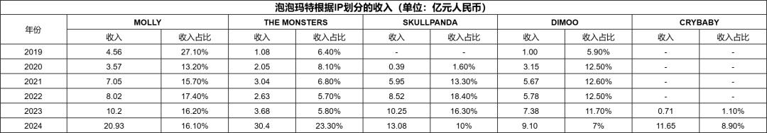 从2019年到2023年,长达5年时间里,The Monsters的表现一直四平八稳,IP收入从1.08亿上升至3.68亿,收入占比最高也不过8.1%,不仅无法比肩MOLLY,还被同期推出的DIMOO赶超后越落越远,上升势头也远不及2020年推出的Skullpanda。