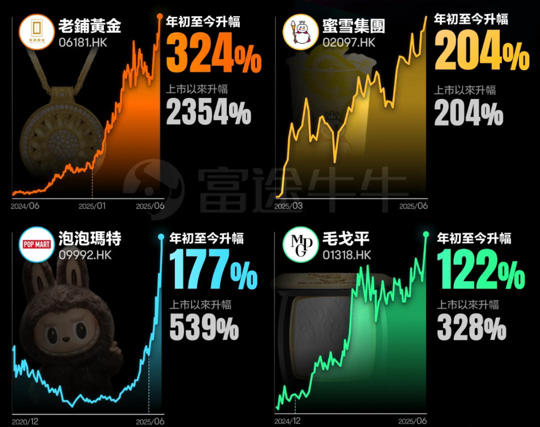 在资本市场,泡泡玛特这一天的股价再创新高,德意志银行直接把泡泡玛特目标价上调至303港元。连续大涨让泡泡玛特和蜜雪集团、老铺黄金、毛戈平组成了港股“消费四姐妹”,富时中国50指数成分股也在6月4日把泡泡玛特纳入其中。截至6月16日,泡泡玛特的市值已超3600亿港元。