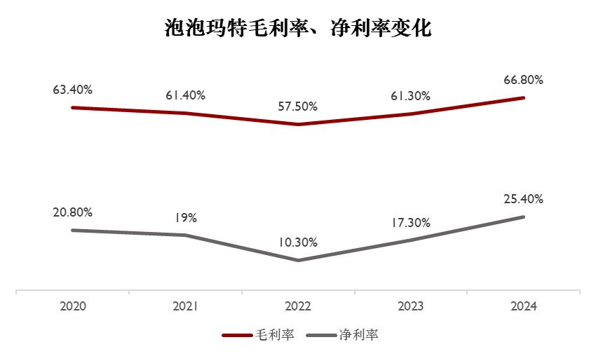 2024年,泡泡玛特整体毛利率达到66.8%,净利率25.4%,把其余的“消费三姐妹”甩在了身后(老铺黄金、蜜雪冰城、毛戈平2024年净利率分别为17.3%、17.9%、22.7%)。 即便在低谷期的2022年,公司毛利率也达到了57.5%,净利率10.3%。