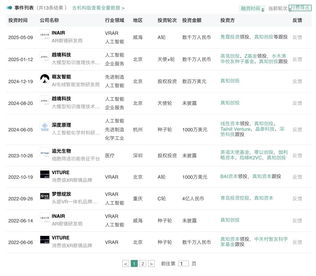 烯牛数据显示,2021年以来,真知创投共计出手13次,先后投资了生命科学AI基础模型开发商百图生科、消费级XR眼镜品牌VITURE、大模型知识推理技术服务提供商趋境科技、AR眼镜研发商INAIR等,大多集中在人工智能领域。