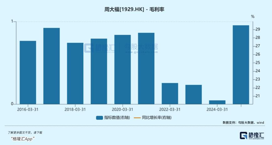 股价下跌的背后,是周大福的业绩未达预期,净利润也远低于市场预期,毛利率甚至降至2009年以来最低。
