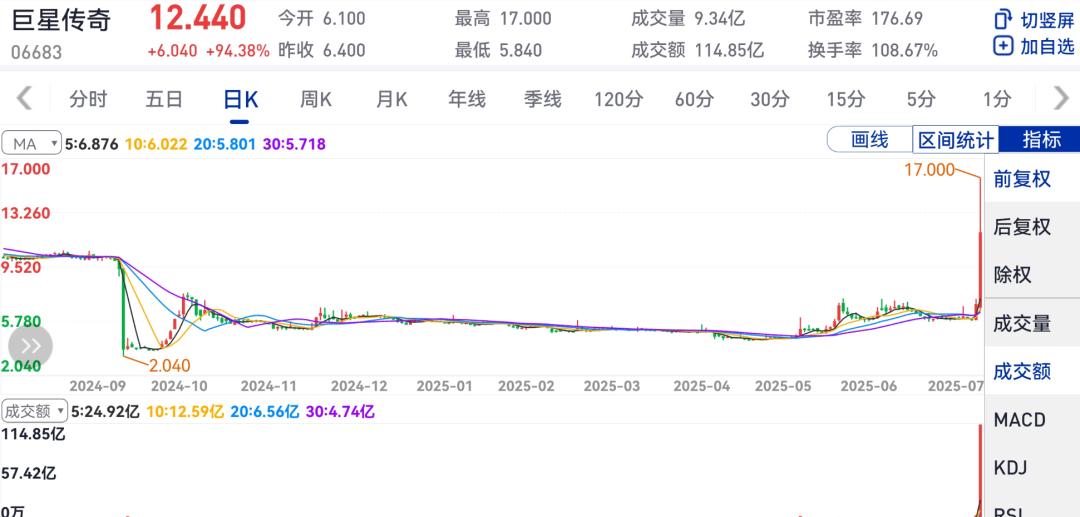 昨日,巨星传奇(06683.HK)小幅低开,到11点多,突然快速拉升,盘中最高涨幅一度超过160%。全天收于12.440港元/股,上涨94.38%,总市值106.9亿港元,一天上涨了约50亿港元。全天交易额达114.8亿港元。