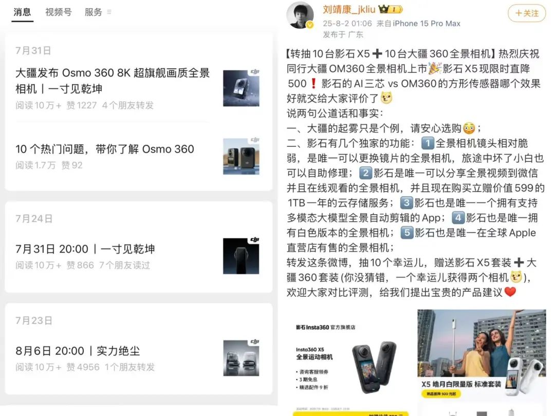 其微博内容先是庆祝同行大疆全景相机上市,随后就给出了“影石X5现限时直降500”的优惠,并以“转抽10台影石X5+10台大疆360全景相机”的活动号召大家评价“影石的AI三芯vsOM360的方形传感器哪个效果好”。