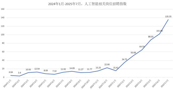 人才需求的激增直接体现在岗位数量上。脉脉数据显示,2025年2月,人工智能相关岗位数量同比增长10倍,成为关键转折点。2025年7月,人工智能相关岗位数量较2024年1月飙升29倍。