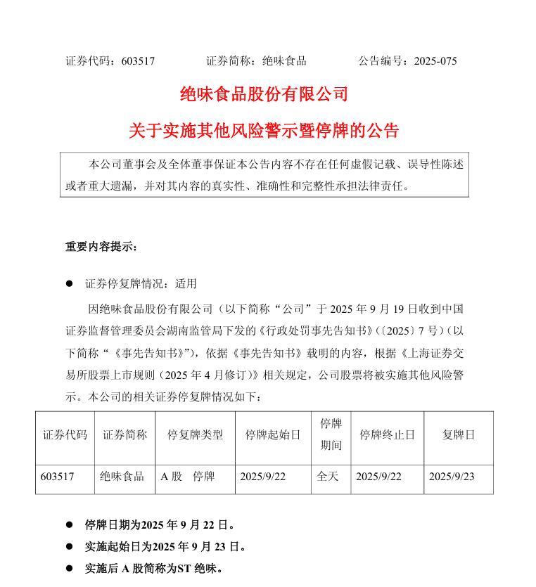 根据《上海证券交易所股票上市规则(2025年4月修订)》相关规定,绝味食品股票将被实施其他风险警示。停牌日期定为2025年9月22日,实施起始日为2025年9月23日,实施后公司A股简称将由“绝味食品”变更为“ST绝味”。