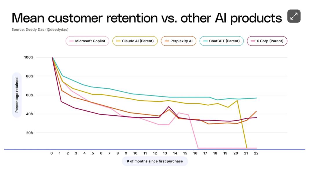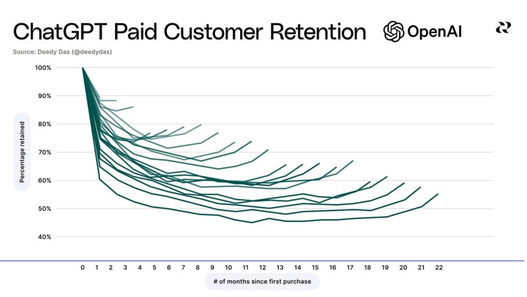 Menlo Ventures 投资人 Deedy Das 公布的数据里,ChatGPT 的留存率已经从两年前的 60% 提升到如今接近 90%,超过了长期保持记录的 YouTube(约 85%)。