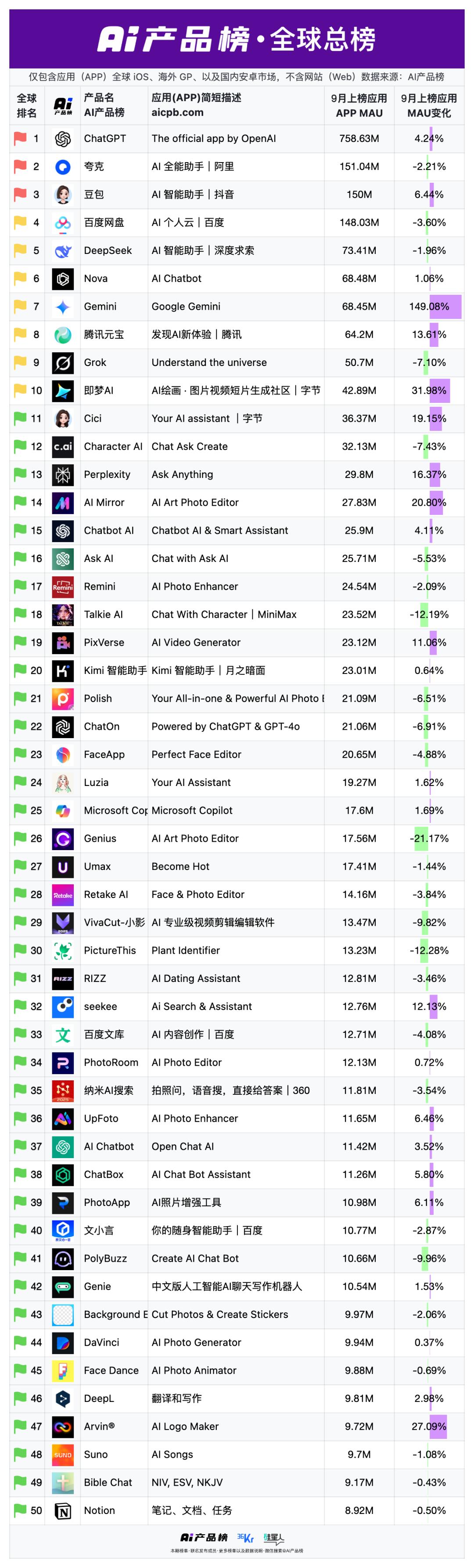 在大厂主导AI产品的情况下,国内AI应用市场还和国外有一个很大的不同:没有绝对领先的AI产品。