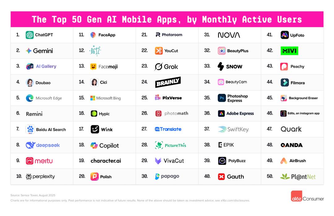 全球榜单上共有34个非中国产品,但只有5个属于“大厂”,占比只有15%,比如ChatGPT(OpenAI)、Gemini(Google)、Grok(X)、Character.AI(Google)和Microsoft Copilot。其他几乎全是Perplexity、PhotoRoom这样的小团队或创业公司。