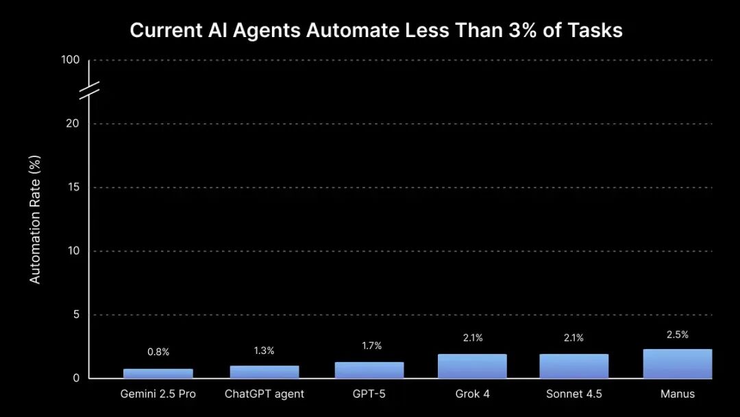 结果嘛,有点惨烈。所有参与测试的AI模型,对复杂项目的整体自动化率,都低于3%。