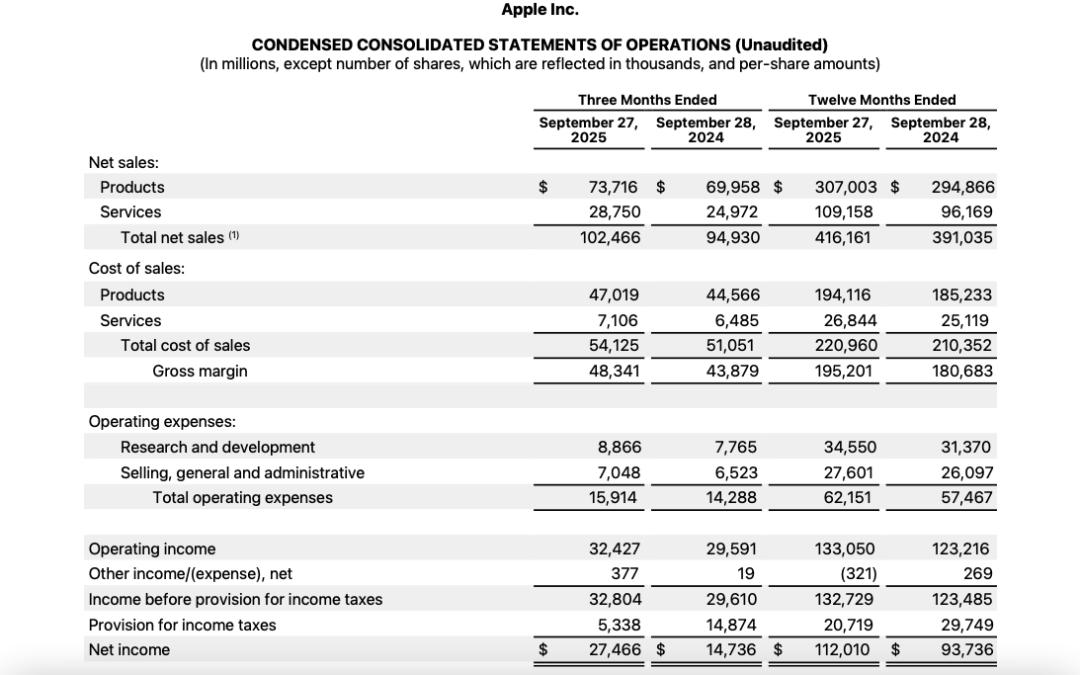 据苹果刚刚披露的2025财年第四季度财报显示,本季总营收达1024.66亿美元,同比增长7.9%;净利润实现274.66亿美元,同比大幅增长86.4%。