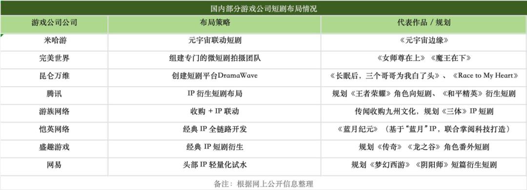 此外,短剧赛道的异军突起,也让游戏公司找到了轻量化跨界的新路径,多家企业已形成明确布局: