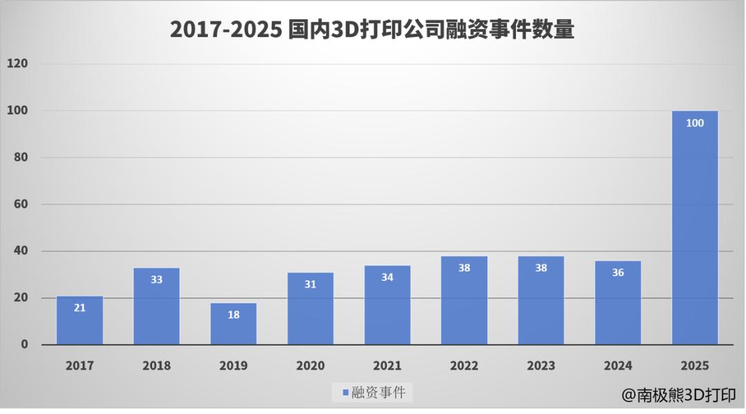 零散的融资案例之外,一组核心数据更能印证赛道的热度飙升。据南极熊3D打印的数据,过去几年,国内3D打印行业投融资事件基本上维持在30-40个之间,而2025年的融资事件直接达到100个(涉及81家公司,部分公司融资2-3次),翻了快3倍。