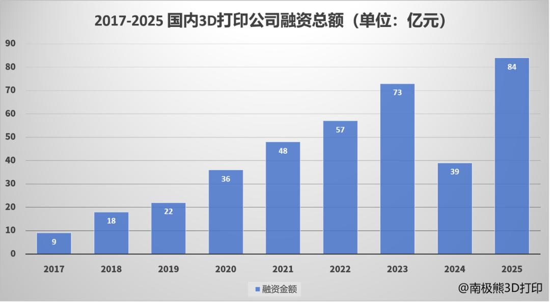 融资金额维度同样印证了赛道的资本热度。据同一数据源,2025年国内3D打印行业投融资总额约84亿元,创历史新高并扭转2024年下跌走势。不过行业融资并非持续高增,2023-2024年受资本市场大环境影响有所承压。
