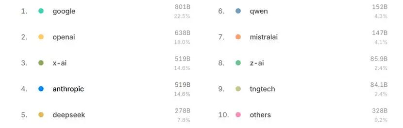 图:当月大模型厂商市占率,来源:OpenRouter
